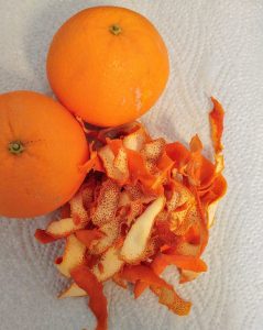 Nach dem Waschen, schäle ich die ganze Frucht mit dem Sparschäler und lasse die Schalen in einer Schüssel auf der Heizung trocknen.