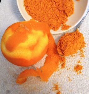 Wenn die Schalen richtig trocken sind, zerkleinere ich sie im Mixer bis sie Pulver sind.