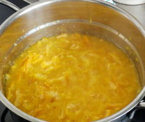 Am Morgen erhitzt man die Orangen bis sie köcheln und lässt sie auf kleiner Flamme 30 Minuten blubbern. Gelegentlich umrühren…das duftet einfach