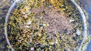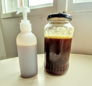 Den Tee lasse ich dann über Nacht ziehen. Am nächsten Tag siebe ich die nötige Menge des Tees in ein Gefäß ab, mische Jojobaöl, Zitronensäure, Betain, Rewoderm und ätherisches Öl zusammen und fertig 😉 Je nach Zusammensetzung der Kräutermischung sieht auch die Farbe aus. Mein Shampoo ist sehr dunkel.