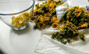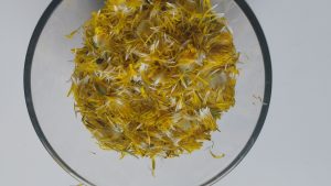 Zum Sammeln der Blüten habe ich mir“ hundefreie“ Stellen gesucht und etwa 8 bis 10 Hände voll Blütenköpfe gesammelt.